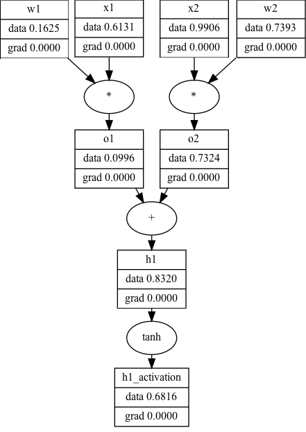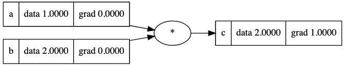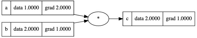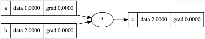 A computational graph in its simplest form - two variables - a=1 and b=2 being multipled to produce a third value, c=2. The code to generate these visuals was adapted from Karpathy's code in Micrograd.
