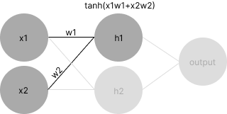 Let’s pretend that we have a very, very small neural network with two inputs, two hidden nodes, and a single output. Let’s also pretend that we have just computed the activation for a single neuron in the hidden layer, h1. In the graph, we will assume dark gray nodes have triggered as of the present time and light gray nodes have not yet triggered. Here’s what the traditional view of this might look like: